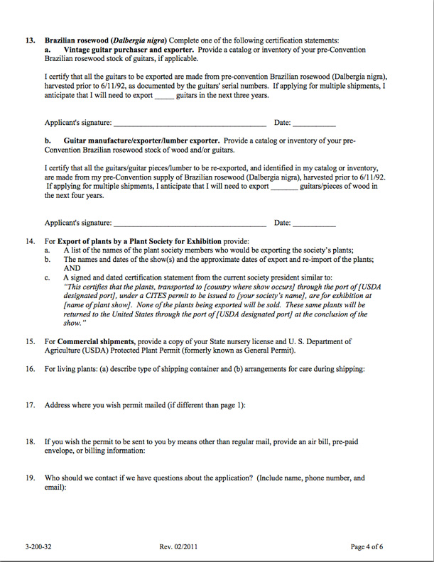 Step 3) Once you have the required permits, a few days prior to shipping you should call to make an appointment for an inspection of the guitars and to ship the instruments from the regional office, and to complete the Wildlife Declaration form.