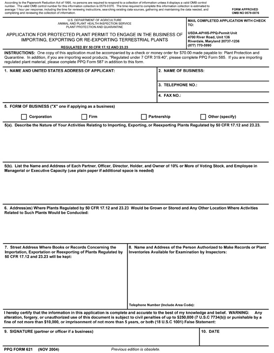 The USDA Application for Protected Plant Permit to Engage in the Business of Importing, Exporting, or Re-Exporting Terrestrial Plants.