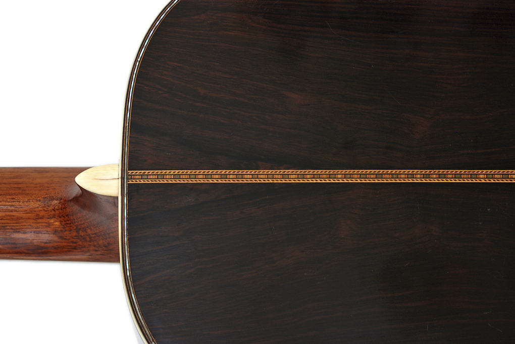 was a strip of wood marquetry down the center of the back. Fingerboard