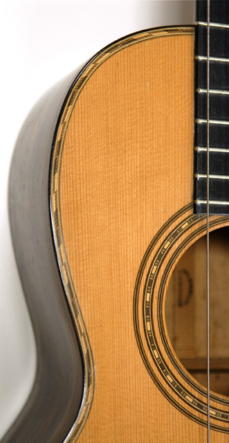 The top is red spruce, and the fingerboard is of simple ebony, without