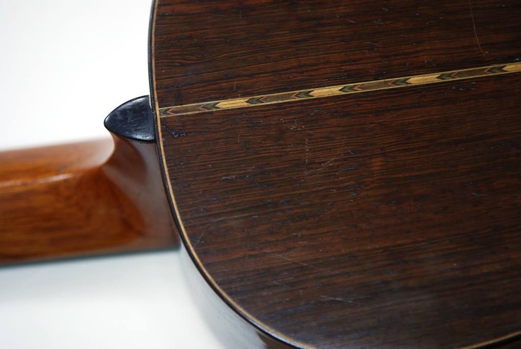 near the heel.  The guitar comes with it's original wooden "Coffin"